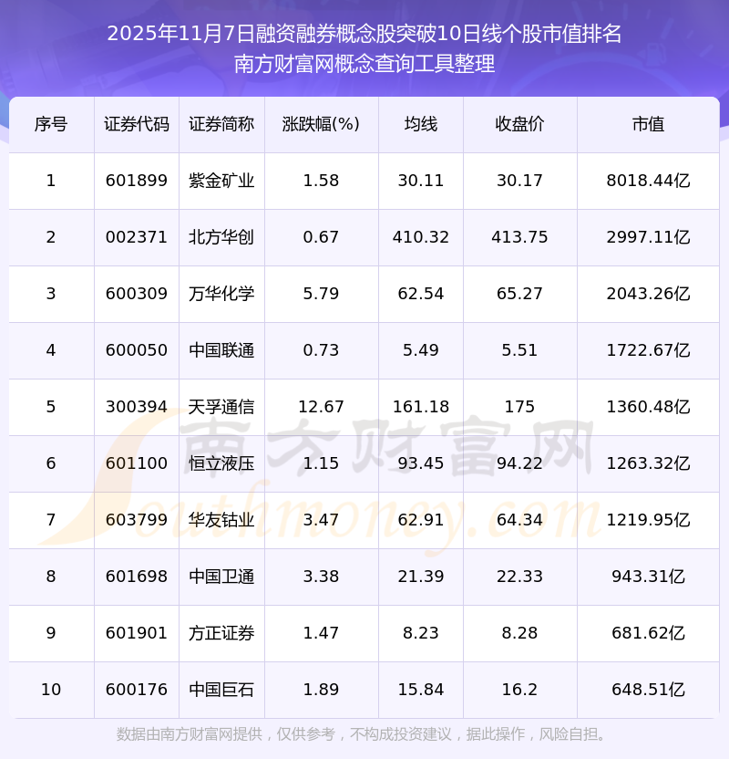 2025年11月7日融資融券概念股突破10日線個股市值排名