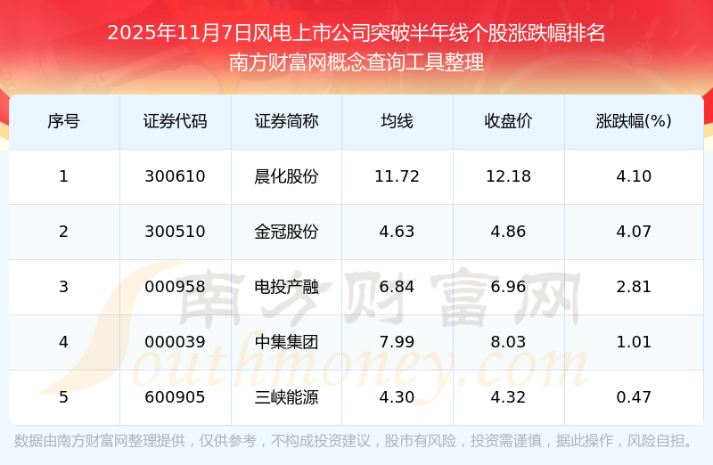 根據(jù)南方財富網(wǎng)概念查詢工具數(shù)據(jù)統(tǒng)計,截止2025年11月7日收盤,風電上市公司共有5只個股收盤價向上突破了半年線。其中漲幅較大的個股有晨化股份、金冠股份、電投產(chǎn)融等,漲幅分別為4.10%、4.07%、2.81%。