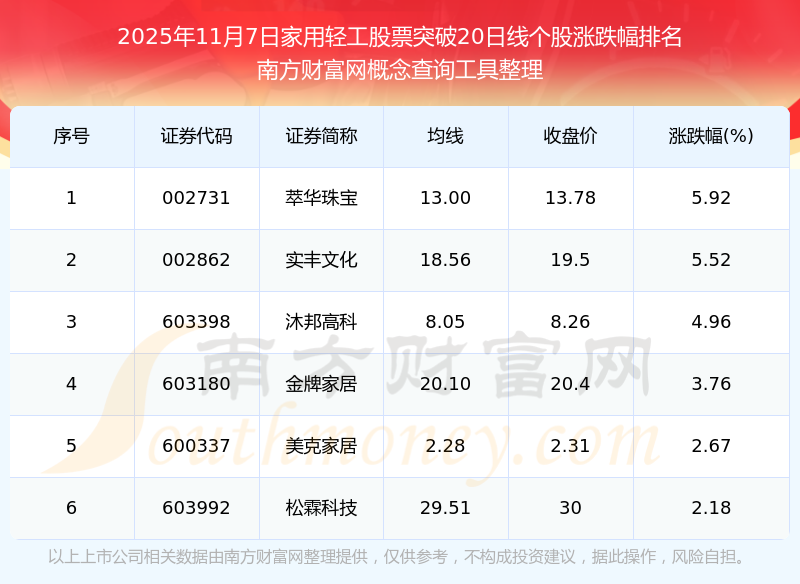 根據(jù)南方財(cái)富網(wǎng)概念查詢工具數(shù)據(jù)統(tǒng)計(jì),截止2025年11月7日收盤,家用輕工股票共有6只個(gè)股收盤價(jià)向上突破了20日線。其中漲幅較大的個(gè)股有萃華珠寶、實(shí)豐文化、沐邦高科等,漲幅分別為5.92%、5.52%、4.96%。