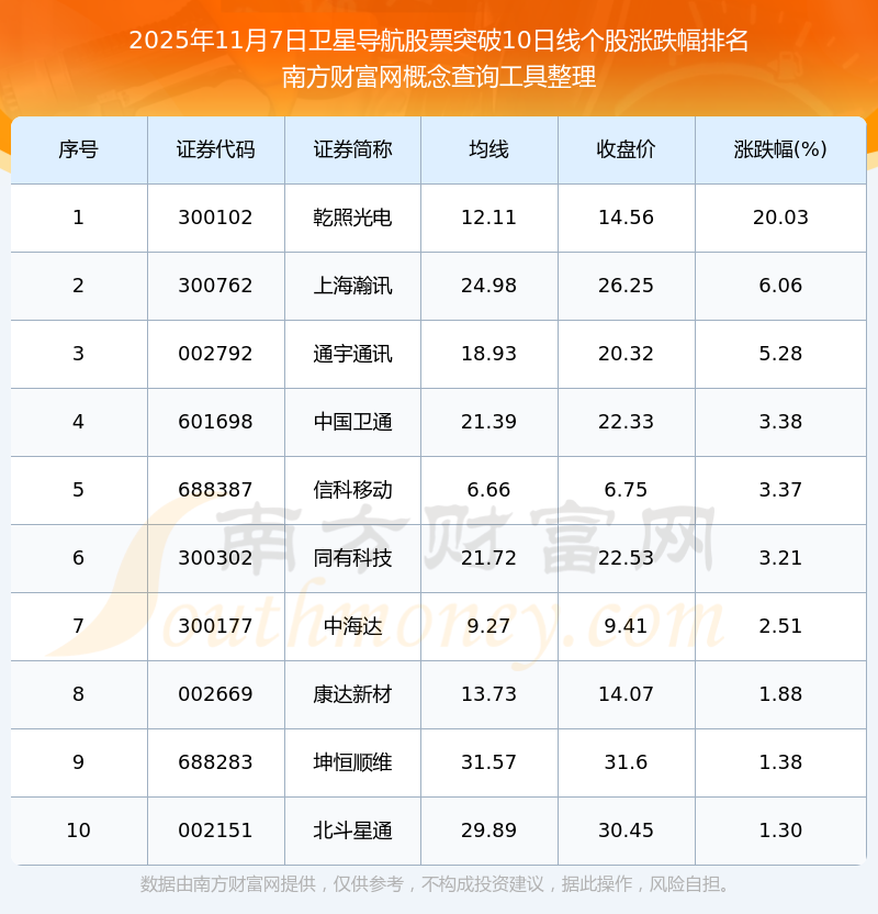 2025年11月7日衛(wèi)星導航股票突破10日線個股漲跌幅排名