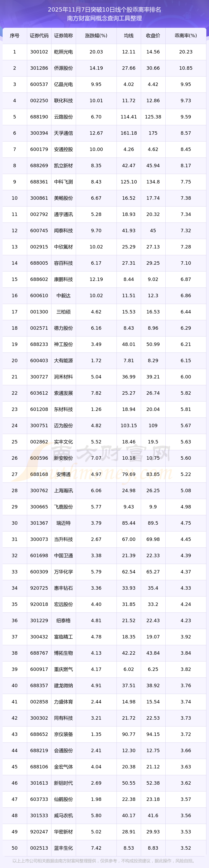 2025年11月7日突破10日線個(gè)股乖離率排名