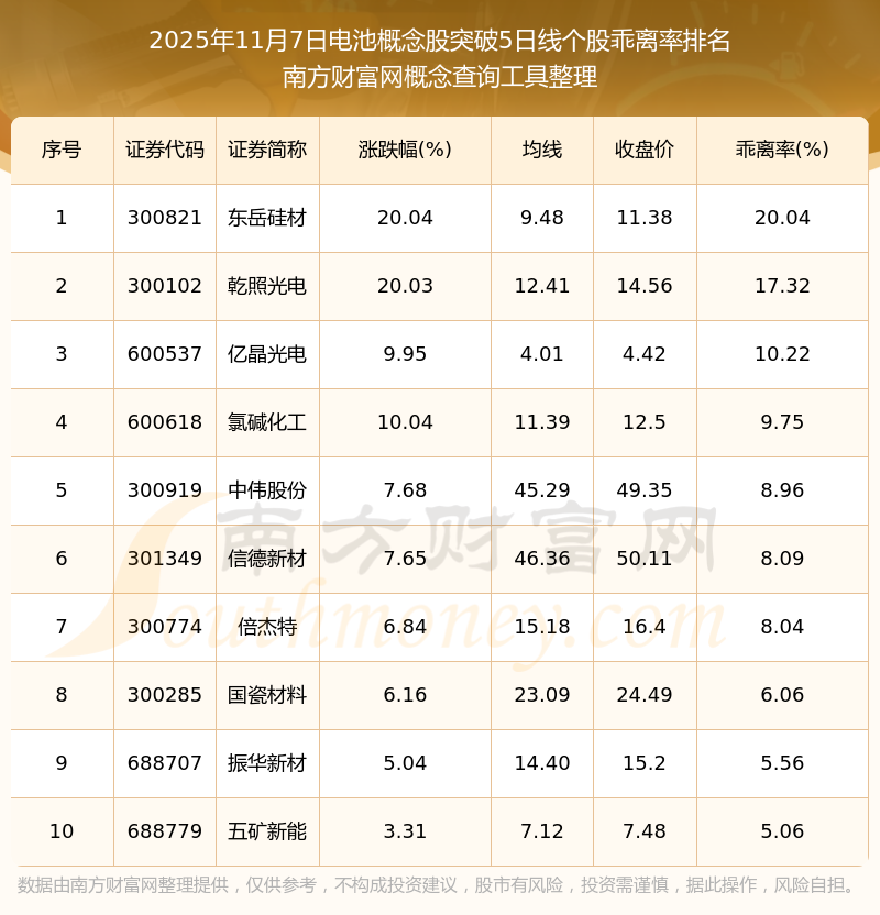 2025年11月7日電池概念股突破5日線個(gè)股乖離率排名