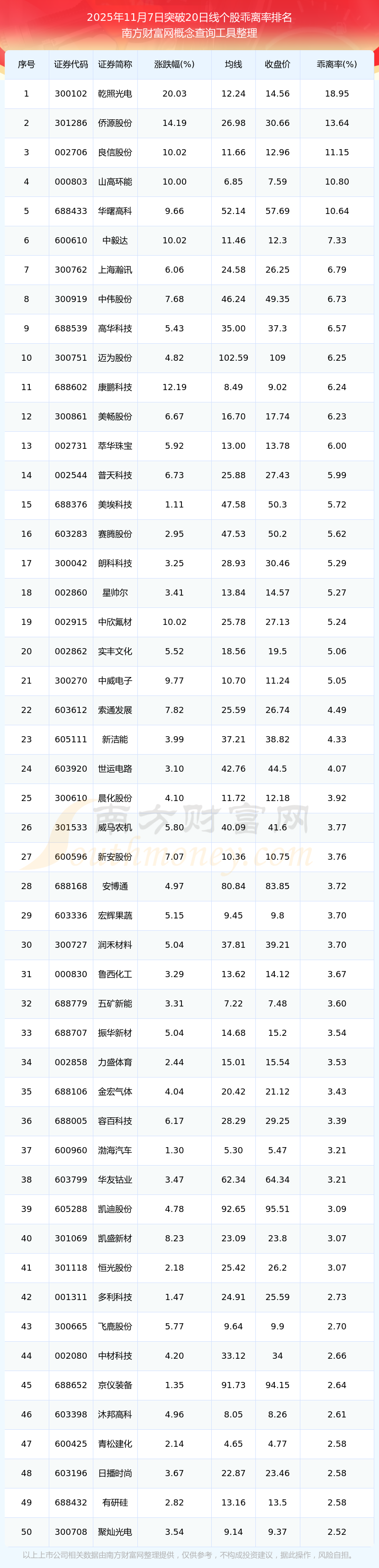 根據(jù)南方財富網(wǎng)概念查詢工具數(shù)據(jù)統(tǒng)計,截止2025年11月7日收盤,共有181只個股收盤價向上突破了20日線,其中乖離率較大的個股有乾照光電、僑源股份、良信股份、山高環(huán)能、華曙高科等,乖離率分別為18.95%、13.64%、11.15%、10.80%、10.64%。
