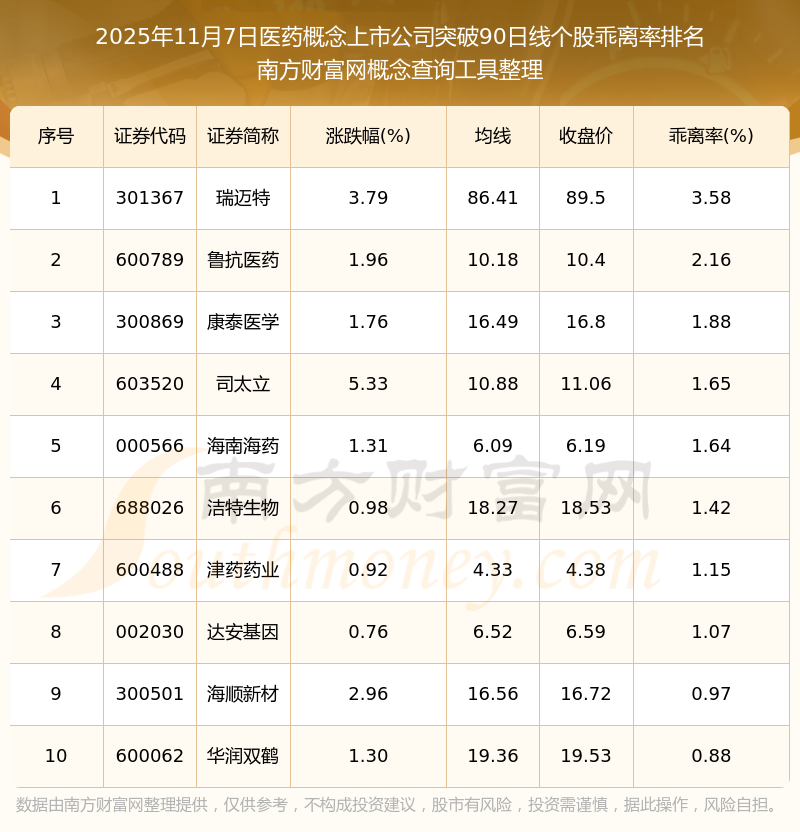 根據(jù)南方財(cái)富網(wǎng)概念查詢工具數(shù)據(jù)統(tǒng)計(jì),截止2025年11月7日收盤,醫(yī)藥概念上市公司共有24只個(gè)股收盤價(jià)向上突破了90日線。其中乖離率較大的個(gè)股有瑞邁特、魯抗醫(yī)藥、康泰醫(yī)學(xué)等,乖離率分別為3.58%、2.16%、1.88%。