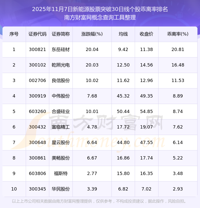2025年11月7日新能源股票突破30日線個(gè)股乖離率排名