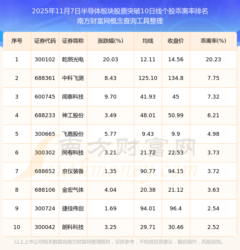 2025年11月7日半導體板塊股票突破10日線個股乖離率排名