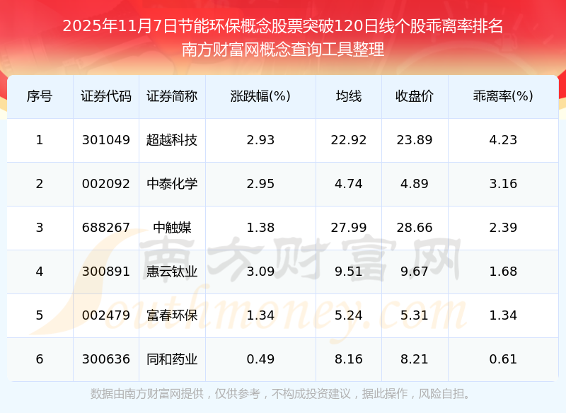 根據(jù)南方財(cái)富網(wǎng)概念查詢工具數(shù)據(jù)統(tǒng)計(jì),截止2025年11月7日收盤,節(jié)能環(huán)保概念股票共有6只個(gè)股收盤價(jià)向上突破了120日線。其中乖離率較大的個(gè)股有超越科技、中泰化學(xué)、中觸媒等,乖離率分別為4.23%、3.16%、2.39%。