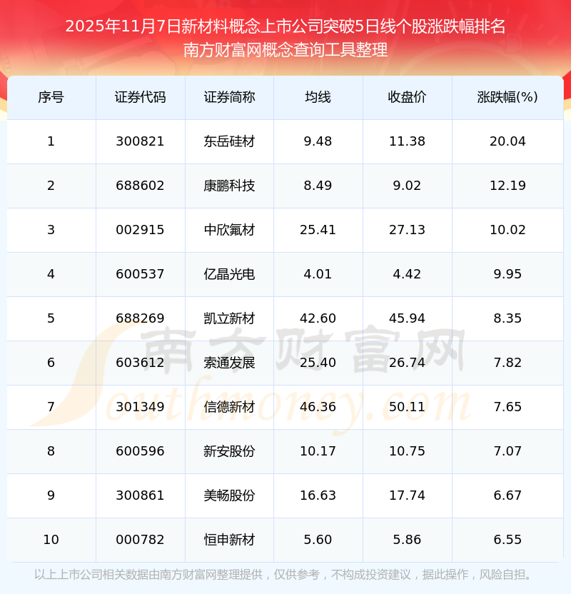 2025年11月7日新材料概念上市公司突破5日線(xiàn)個(gè)股漲跌幅排名