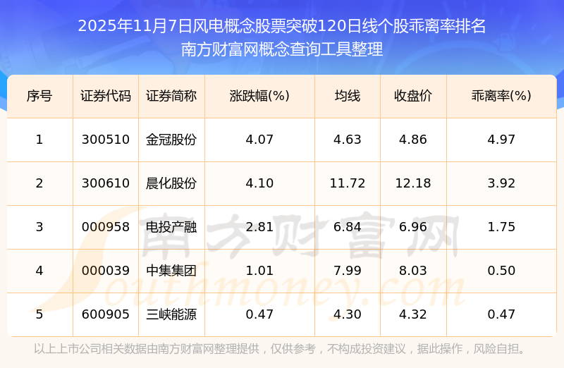 2025年11月7日風(fēng)電概念股票突破120日線個(gè)股乖離率排名