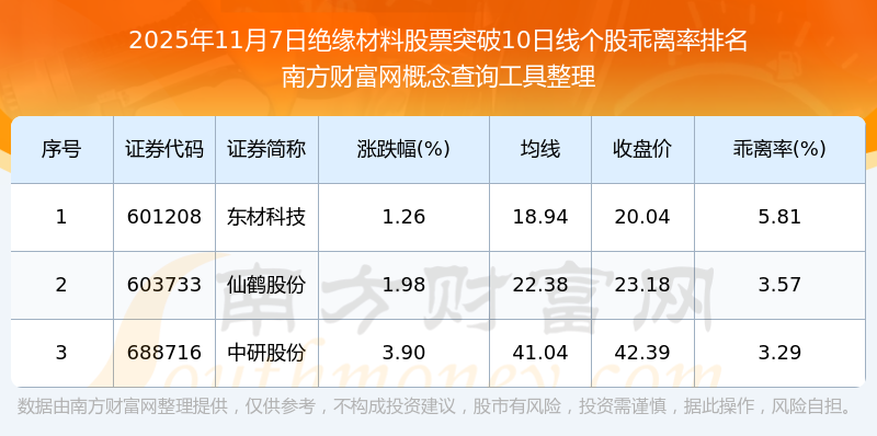 2025年11月7日絕緣材料股票突破10日線個(gè)股乖離率排名