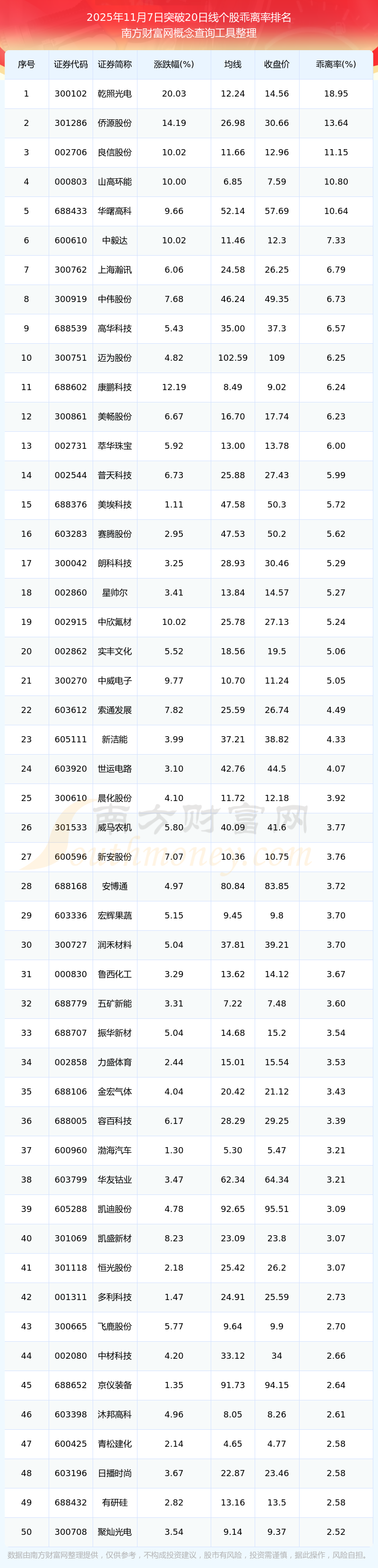 2025年11月7日突破20日線個(gè)股乖離率排名