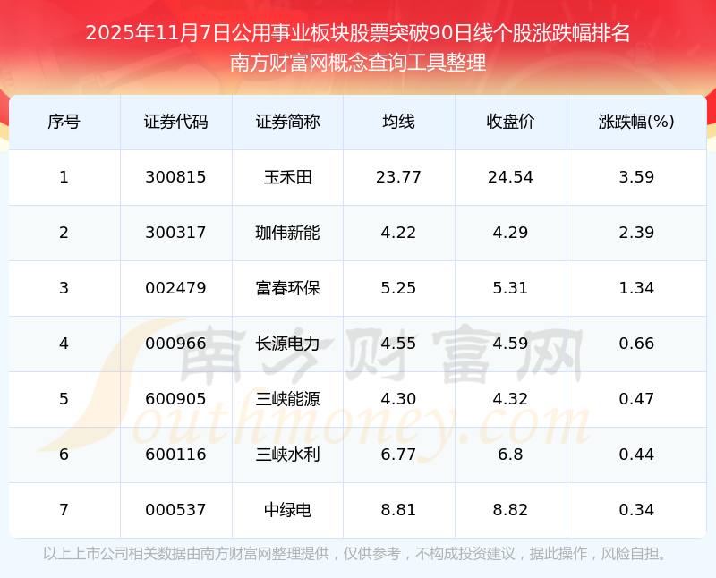 2025年11月7日公用事業(yè)板塊股票突破90日線個股漲跌幅排名