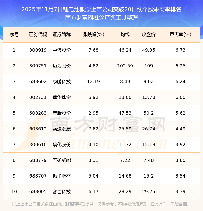 2025年11月7日鋰電池概念上市公司突破20日線個股乖離率排名
