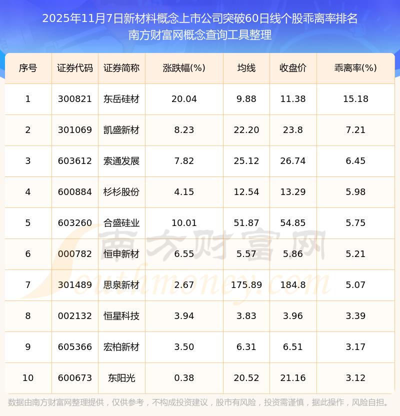 根據(jù)南方財富網(wǎng)概念查詢工具數(shù)據(jù)統(tǒng)計,截止2025年11月7日收盤,新材料概念上市公司共有41只個股收盤價向上突破了60日線。其中乖離率較大的個股有東岳硅材、凱盛新材、索通發(fā)展等,乖離率分別為15.18%、7.21%、6.45%。