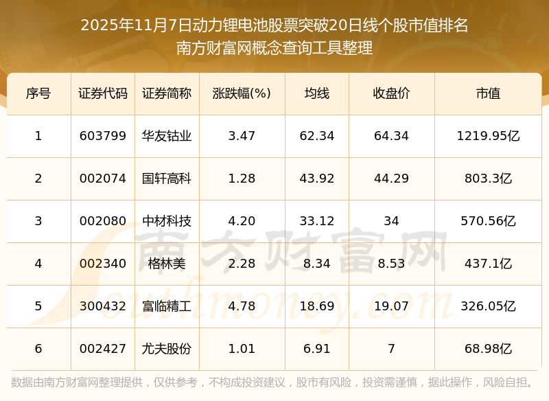 2025年11月7日動(dòng)力鋰電池股票突破20日線個(gè)股市值排名