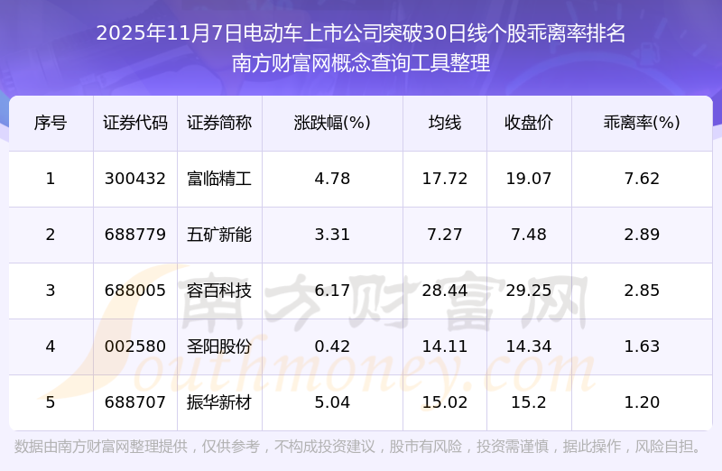 根據(jù)南方財富網(wǎng)概念查詢工具數(shù)據(jù)統(tǒng)計,截止2025年11月7日收盤,電動車上市公司共有5只個股收盤價向上突破了30日線。其中乖離率較大的個股有富臨精工、五礦新能、容百科技等,乖離率分別為7.62%、2.89%、2.85%。
