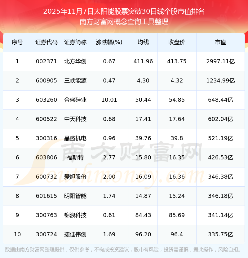 2025年11月7日太陽能股票突破30日線個(gè)股市值排名