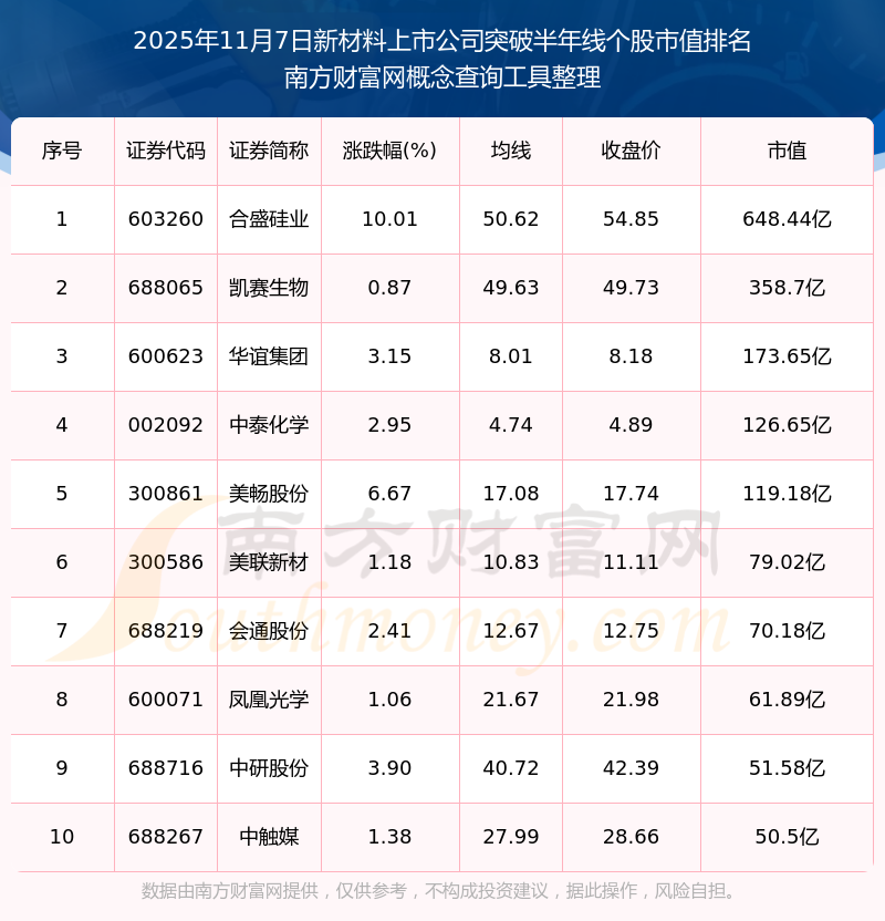 2025年11月7日新材料上市公司突破半年線個股市值排名