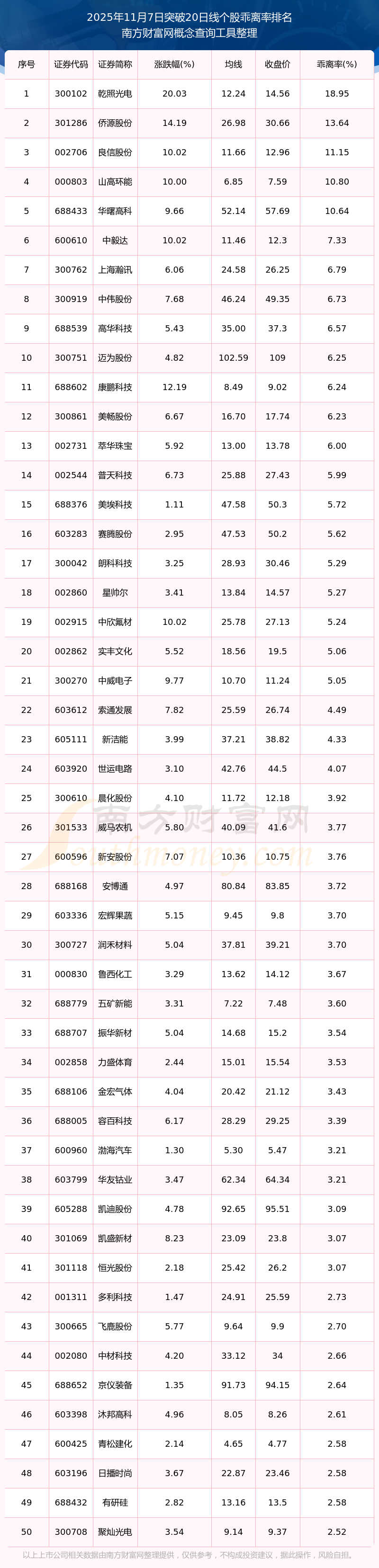 2025年11月7日突破20日線個(gè)股乖離率排名
