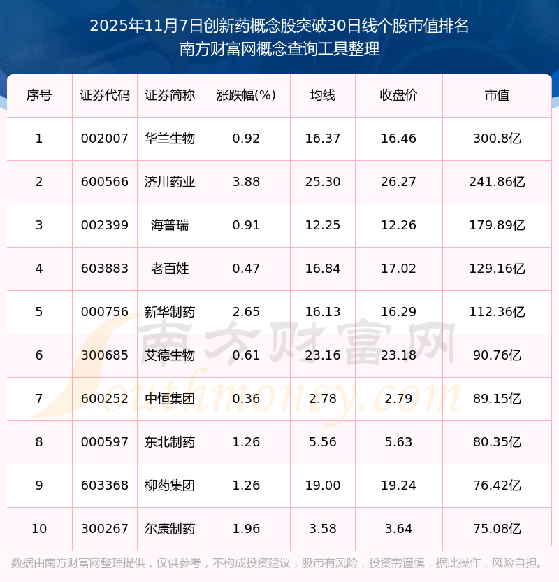 2025年11月7日創(chuàng)新藥概念股突破30日線個(gè)股市值排名