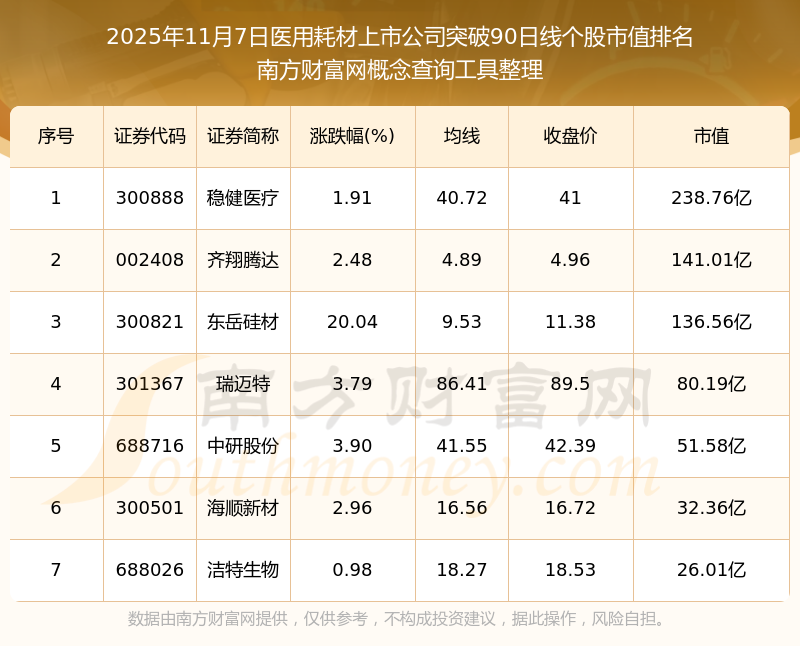 根據(jù)南方財富網(wǎng)概念查詢工具數(shù)據(jù)統(tǒng)計,截止2025年11月7日收盤,醫(yī)用耗材上市公司共有7只個股收盤價向上突破了90日線。其中市值較大的個股有穩(wěn)健醫(yī)療、齊翔騰達、東岳硅材等,市值分別為238.76億、141.01億、136.56億。