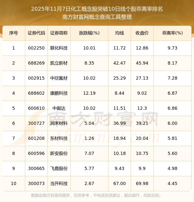 2025年11月7日化工概念股突破10日線個(gè)股乖離率排名