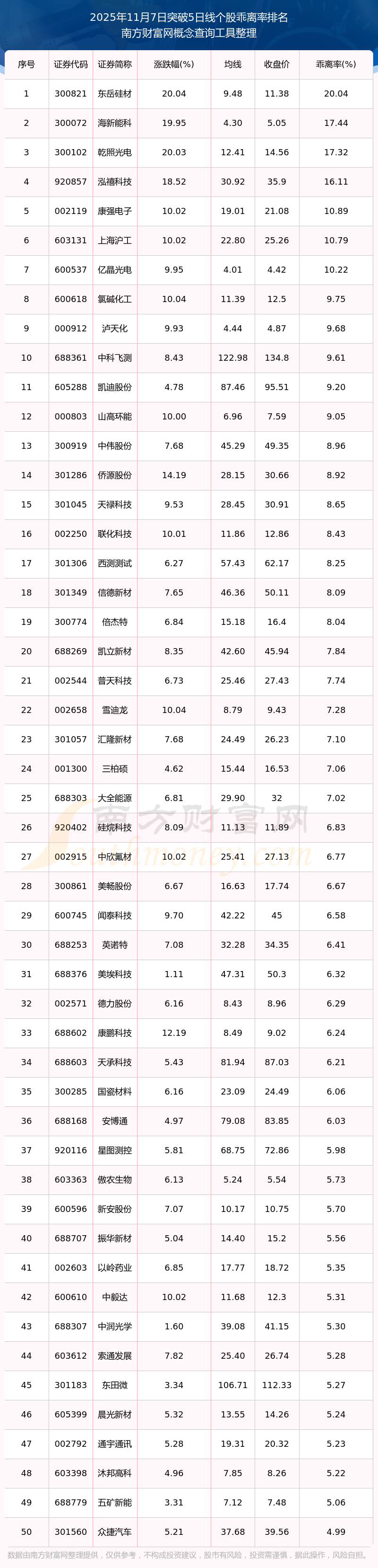 2025年11月7日突破5日線個(gè)股乖離率排名