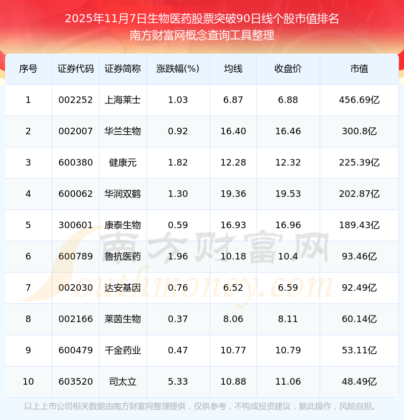 根據(jù)南方財(cái)富網(wǎng)概念查詢工具數(shù)據(jù)統(tǒng)計(jì),截止2025年11月7日收盤,生物醫(yī)藥股票共有13只個(gè)股收盤價(jià)向上突破了90日線。其中市值較大的個(gè)股有上海萊士、華蘭生物、健康元等,市值分別為456.69億、300.8億、225.39億。