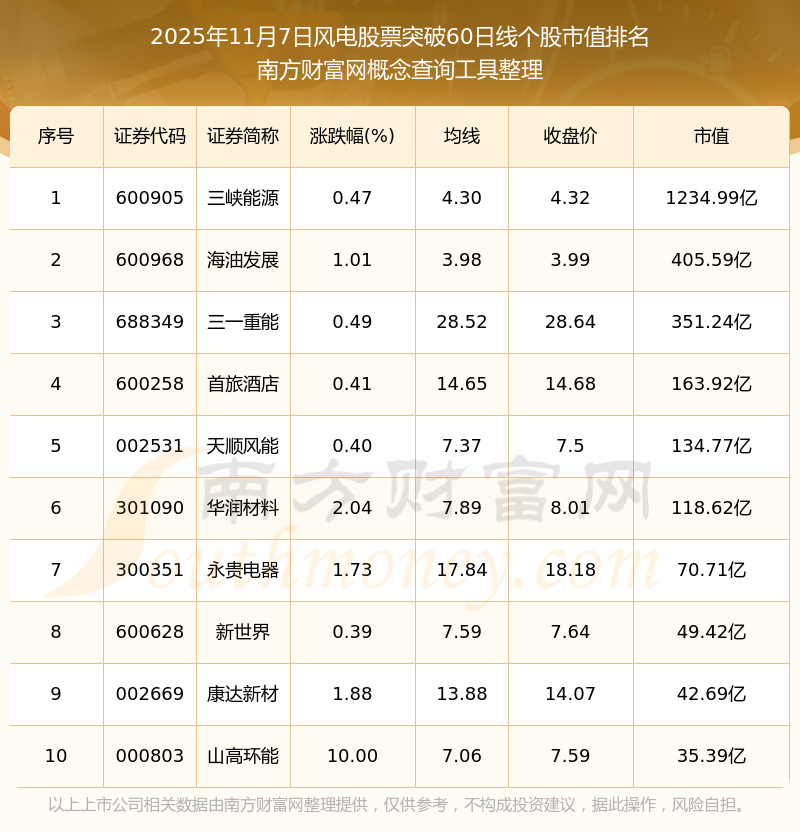 2025年11月7日風(fēng)電股票突破60日線個股市值排名