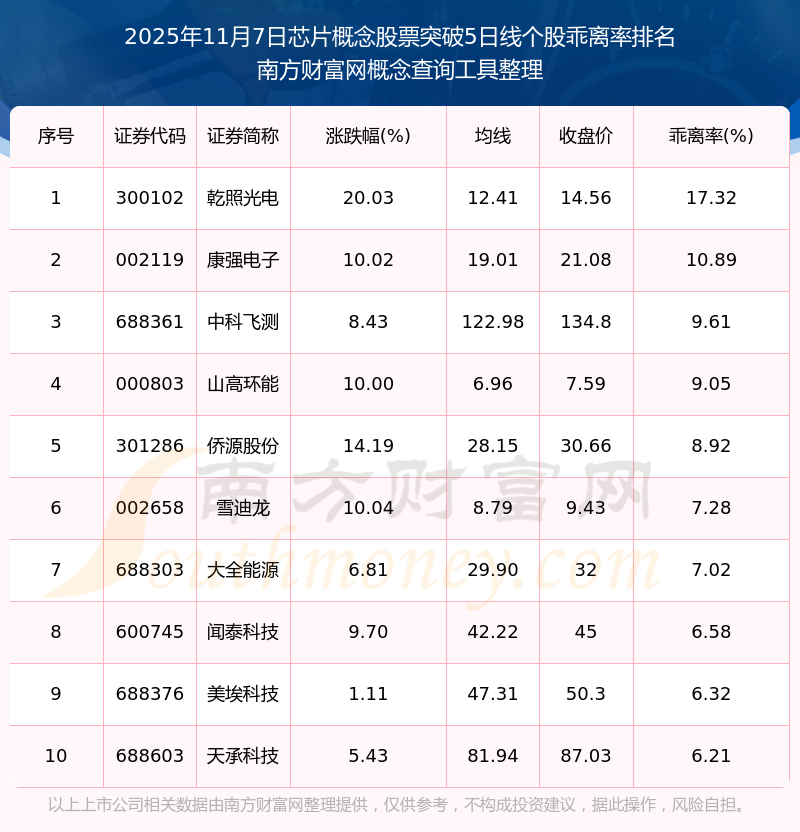 2025年11月7日芯片概念股票突破5日線個(gè)股乖離率排名