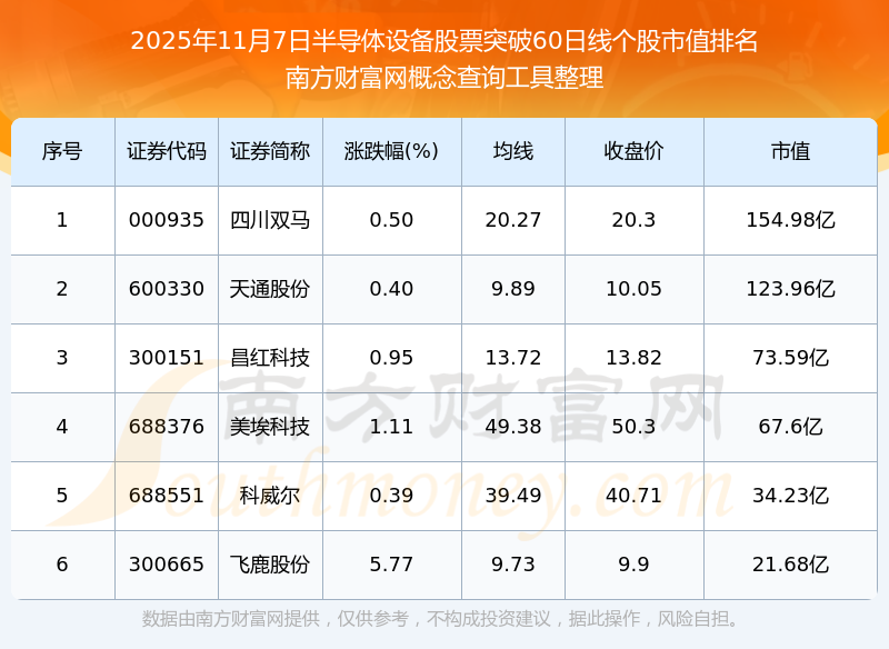 2025年11月7日半導(dǎo)體設(shè)備股票突破60日線個股市值排名