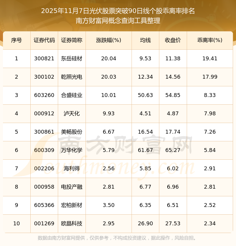 根據(jù)南方財(cái)富網(wǎng)概念查詢工具數(shù)據(jù)統(tǒng)計(jì),截止2025年11月7日收盤,光伏股票共有24只個(gè)股收盤價(jià)向上突破了90日線。其中乖離率較大的個(gè)股有東岳硅材、乾照光電、合盛硅業(yè)等,乖離率分別為19.41%、17.99%、8.33%。