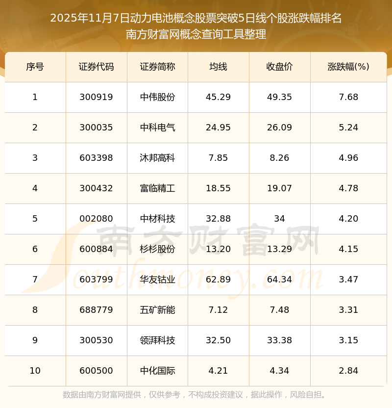 根據(jù)南方財(cái)富網(wǎng)概念查詢工具數(shù)據(jù)統(tǒng)計(jì),截止2025年11月7日收盤,動(dòng)力電池概念股票共有21只個(gè)股收盤價(jià)向上突破了5日線。其中漲幅較大的個(gè)股有中偉股份、中科電氣、沐邦高科等,漲幅分別為7.68%、5.24%、4.96%。