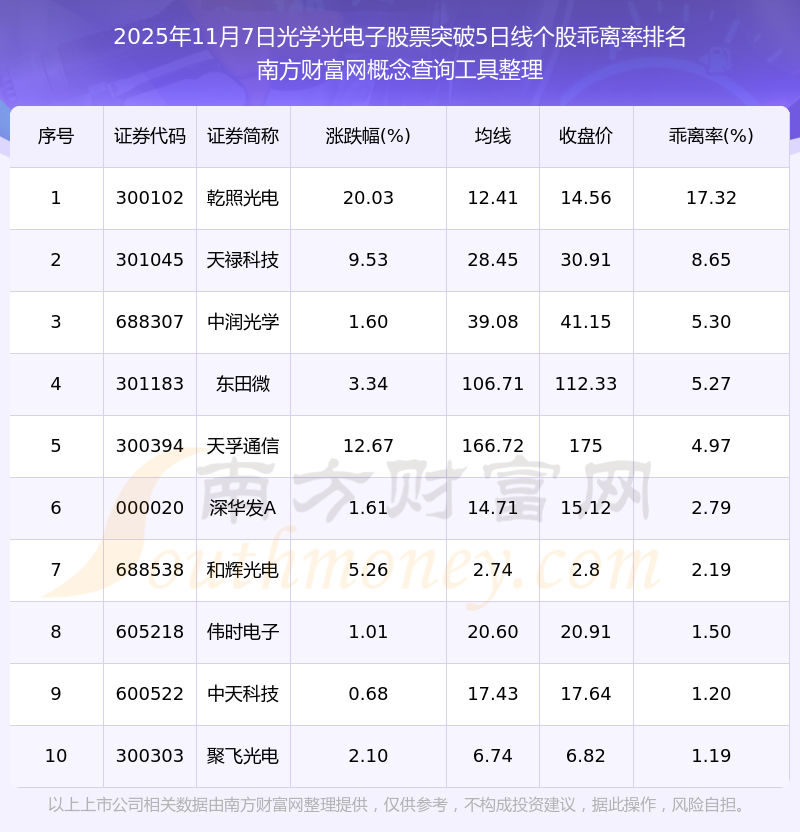 根據南方財富網概念查詢工具數據統(tǒng)計,截止2025年11月7日收盤,光學光電子股票共有14只個股收盤價向上突破了5日線。其中乖離率較大的個股有乾照光電、天祿科技、中潤光學等,乖離率分別為17.32%、8.65%、5.30%。
