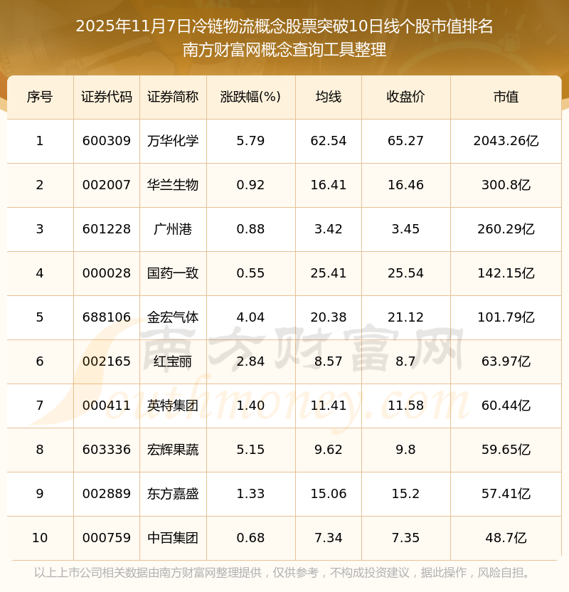 2025年11月7日冷鏈物流概念股票突破10日線個(gè)股市值排名