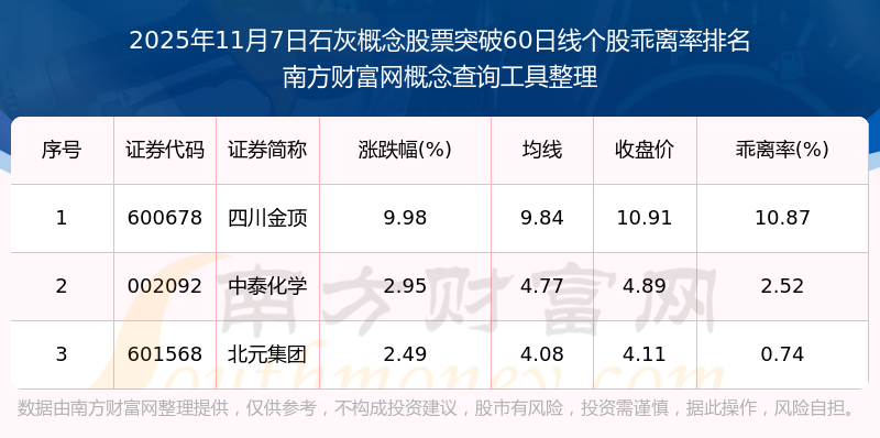 2025年11月7日石灰概念股票突破60日線個股乖離率排名