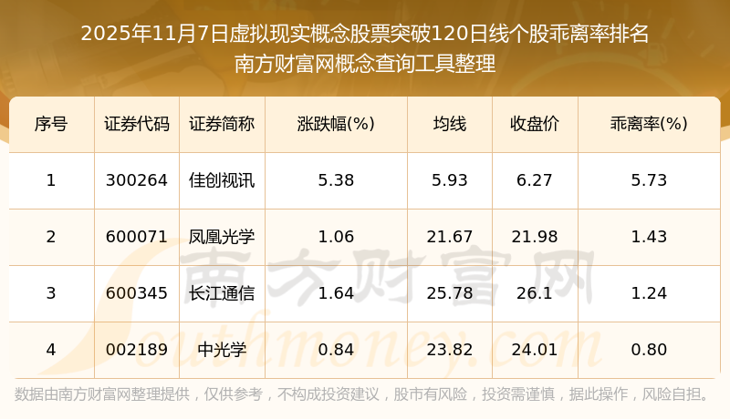 2025年11月7日虛擬現(xiàn)實(shí)概念股票突破120日線個股乖離率排名