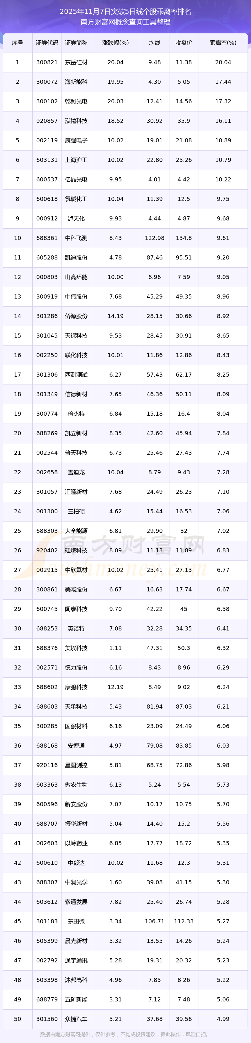 根據(jù)南方財富網(wǎng)概念查詢工具數(shù)據(jù)統(tǒng)計,截止2025年11月7日收盤,共有431只個股收盤價向上突破了5日線,其中乖離率較大的個股有東岳硅材、海新能科、乾照光電、泓禧科技、康強電子等,乖離率分別為20.04%、17.44%、17.32%、16.11%、10.89%。