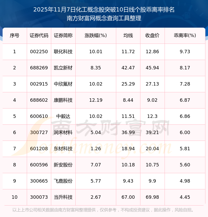 2025年11月7日化工概念股突破10日線個股乖離率排名
