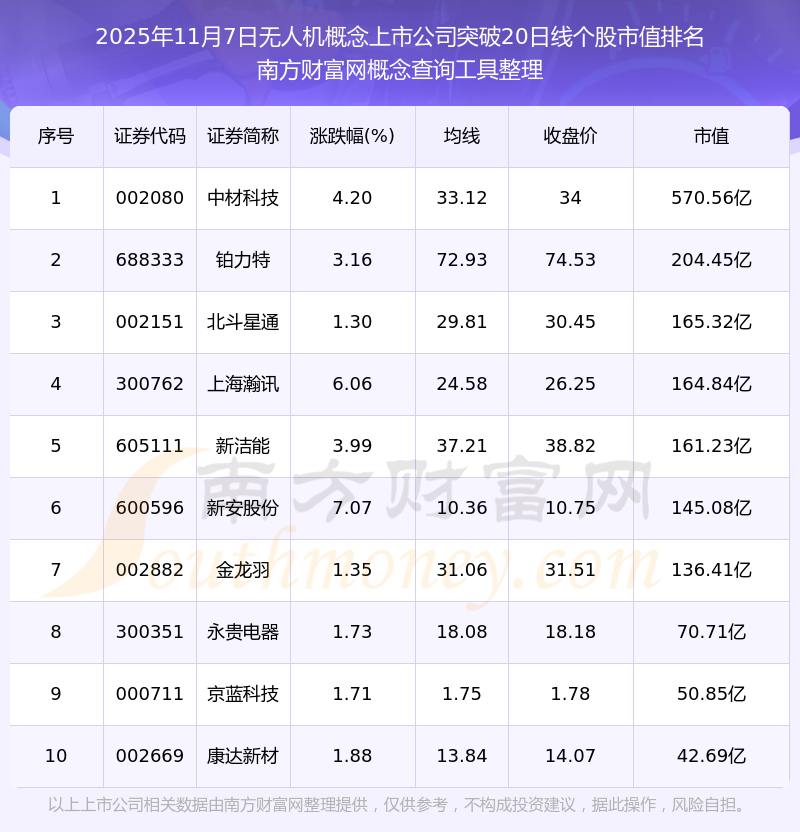 2025年11月7日無人機概念上市公司突破20日線個股市值排名