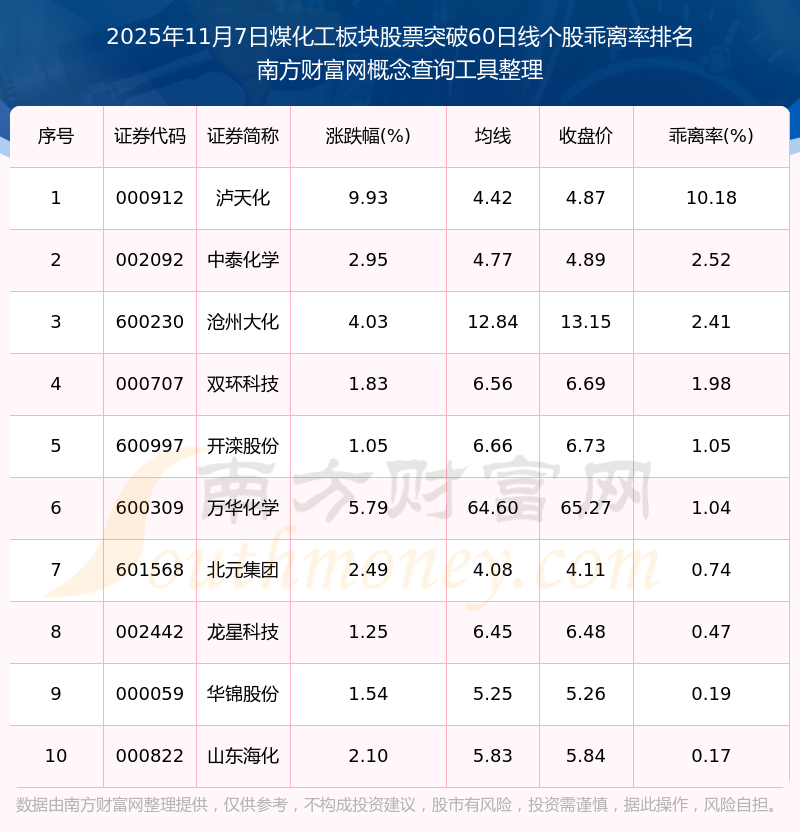 2025年11月7日煤化工板塊股票突破60日線個股乖離率排名