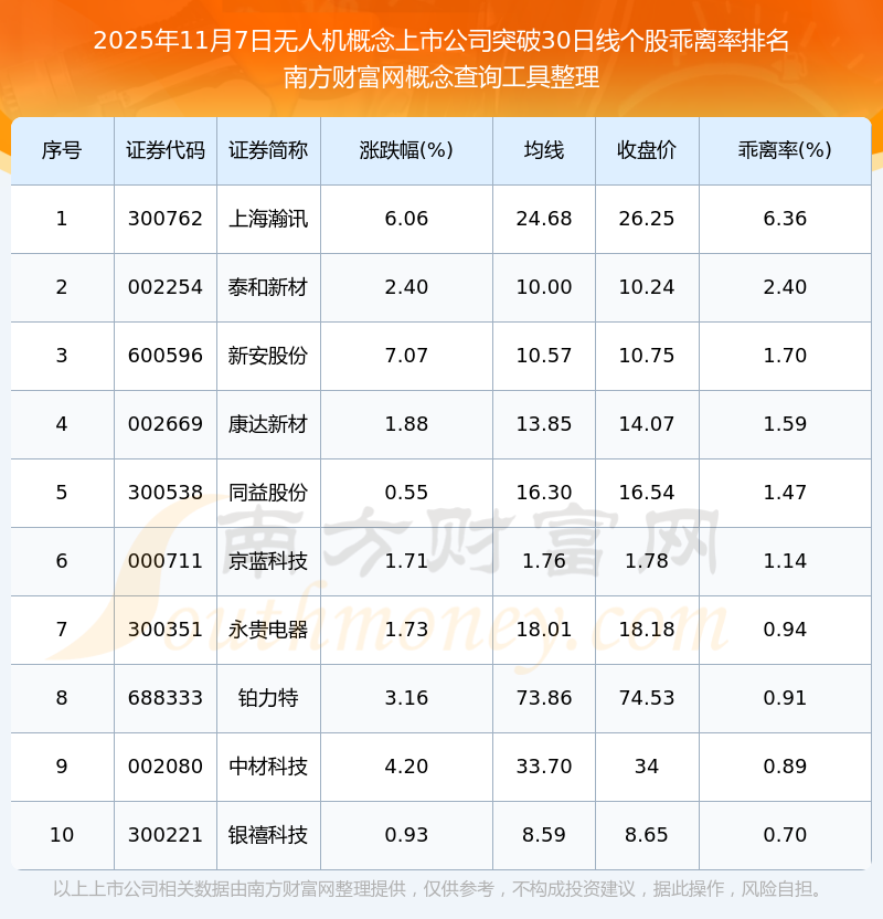 2025年11月7日無(wú)人機(jī)概念上市公司突破30日線個(gè)股乖離率排名