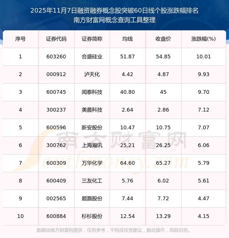 2025年11月7日融資融券概念股突破60日線個(gè)股漲跌幅排名