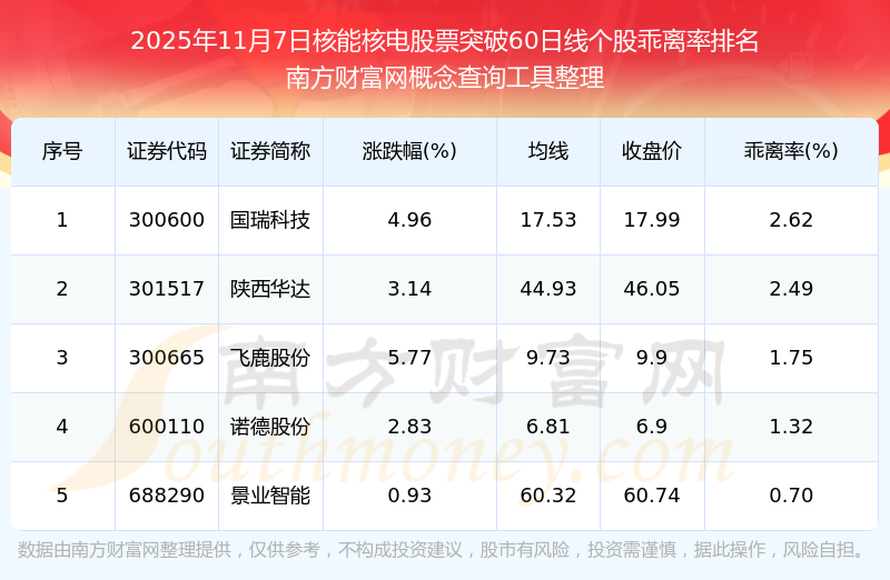 根據(jù)南方財富網(wǎng)概念查詢工具數(shù)據(jù)統(tǒng)計,截止2025年11月7日收盤,核能核電股票共有5只個股收盤價向上突破了60日線。其中乖離率較大的個股有國瑞科技、陜西華達、飛鹿股份等,乖離率分別為2.62%、2.49%、1.75%。
