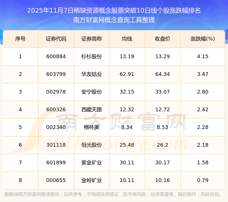 根據(jù)南方財富網(wǎng)概念查詢工具數(shù)據(jù)統(tǒng)計,截止2025年11月7日收盤,稀缺資源概念股票共有8只個股收盤價向上突破了10日線。其中漲幅較大的個股有杉杉股份、華友鈷業(yè)、安寧股份等,漲幅分別為4.15%、3.47%、2.80%。