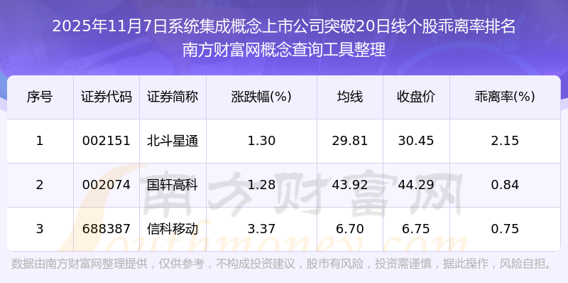 2025年11月7日系統(tǒng)集成概念上市公司突破20日線個(gè)股乖離率排名
