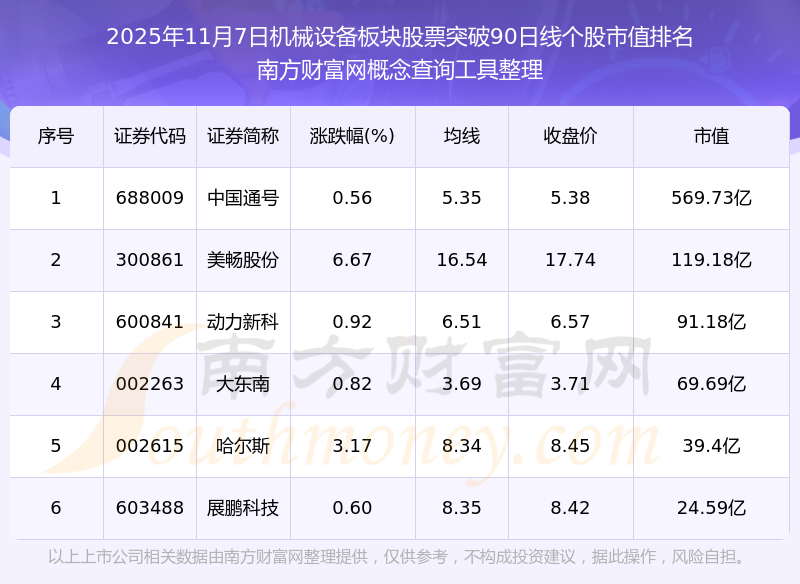 2025年11月7日機械設(shè)備板塊股票突破90日線個股市值排名