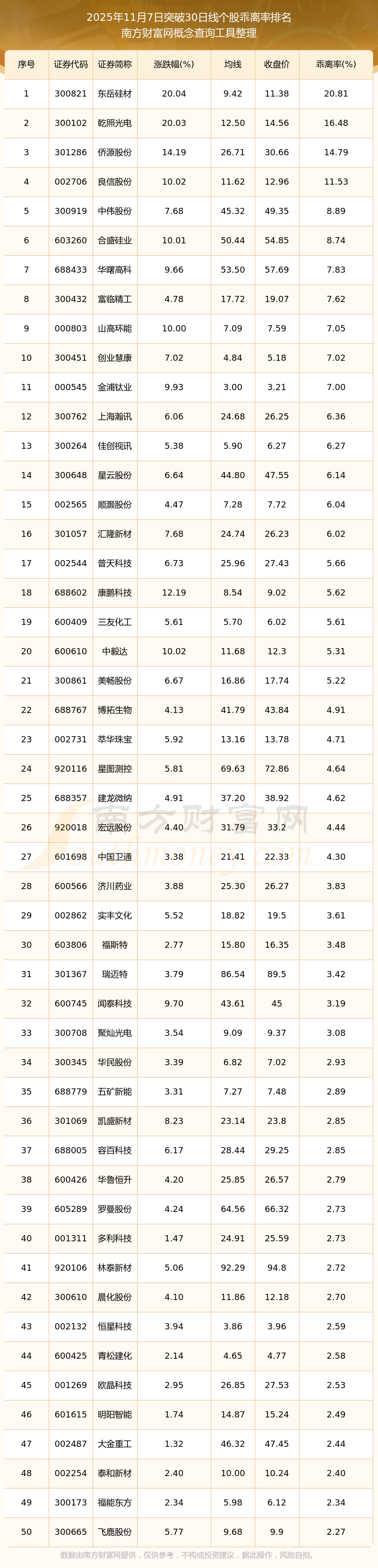 2025年11月7日突破30日線(xiàn)個(gè)股乖離率排名