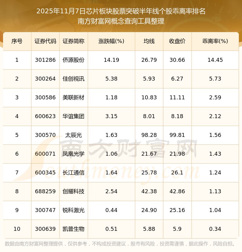 2025年11月7日芯片板塊股票突破半年線個股乖離率排名