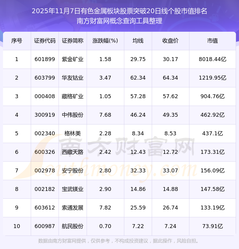 2025年11月7日有色金屬板塊股票突破20日線個(gè)股市值排名